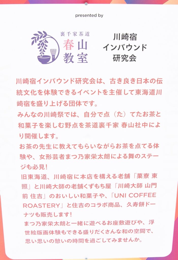 2025/11/02 みんなの川崎祭 2025 11/09 ギャラリー 2025年11月9日 2025年11月2日に開催された「みんなの川崎祭」にて、お呈茶席と茶道体験コーナーを担当いたしました。 ギャラリー 関連記事 2025/11/04 第34回川崎区文化協会美術展 2025/10/13 和菓子作り体験 2025/10/05 東海道川崎宿場まつり 2025/09/23 南河原こども文化センター茶道教室 2025/03・2025/04 陶芸教室 2025/02/23 2025年初釜